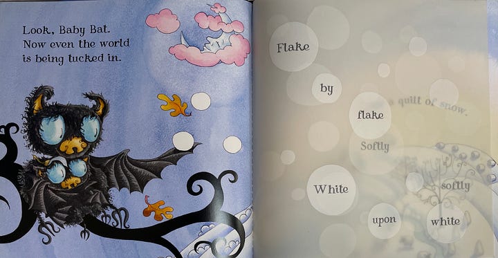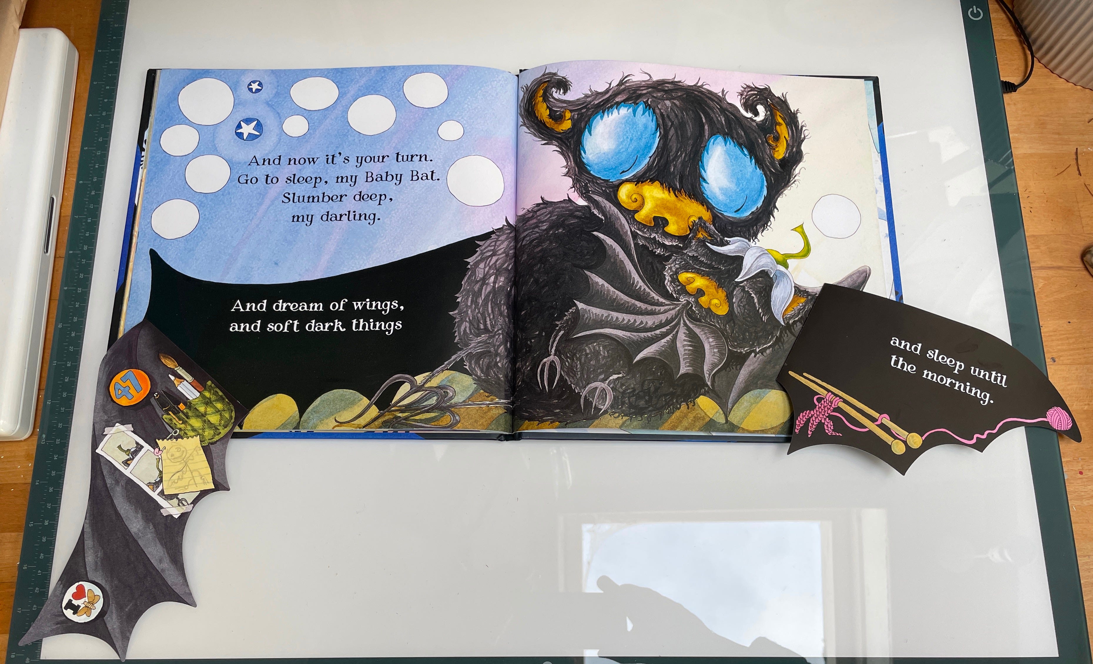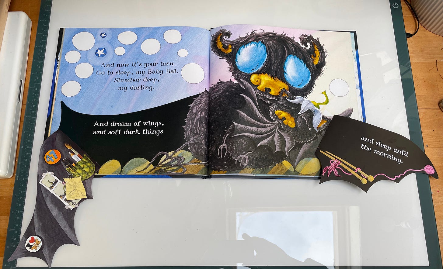 The book bombed, alas. I love it still, but never see it anywhere. But look - inside Mummy Bat’s soft, dark wings, she keeps some interesting things.