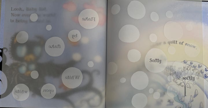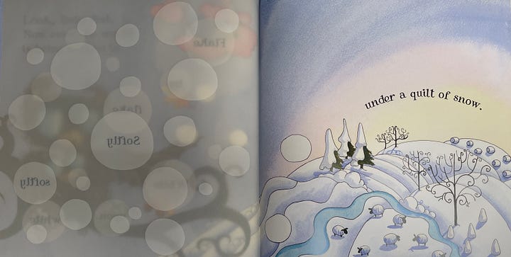 Flake by flake, white upon white, softly, softly under a quilt of snow.