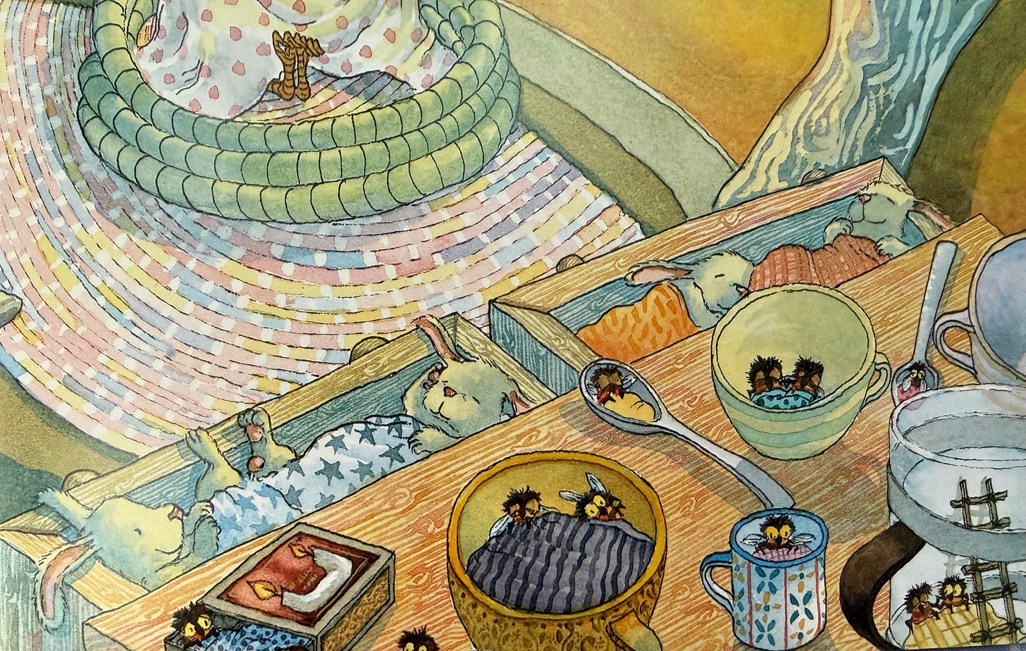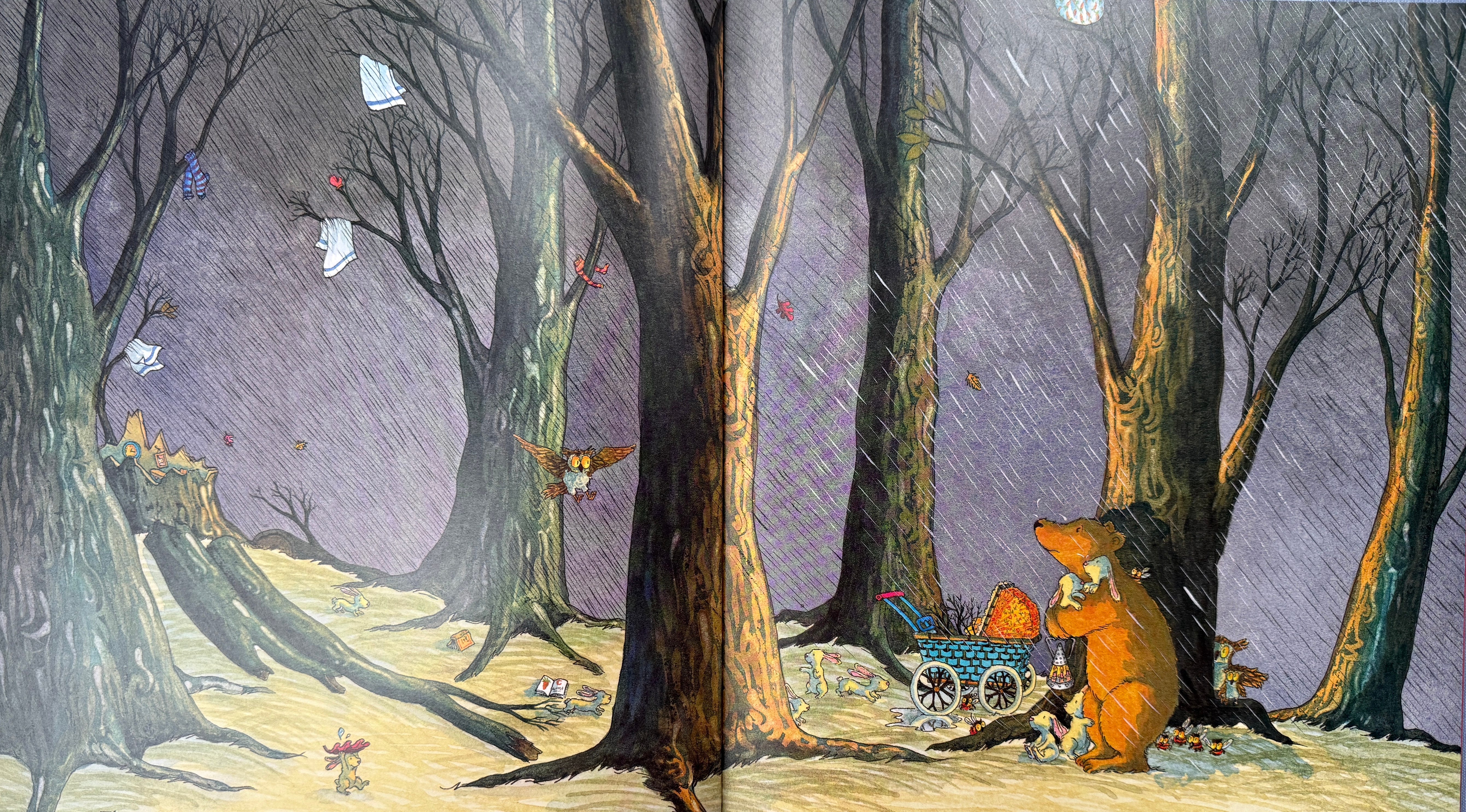 He’d offered to look after us in his Bear House, but deadlines were deadlines. Back in my chilly, tiny cottage, I tended to baby daughter, waited till she finally went to bed that evening, and got on with painting the last spread needed for the Bologna Book Fair. Here, for your viewing pleasure, served with a side order of whiplash.