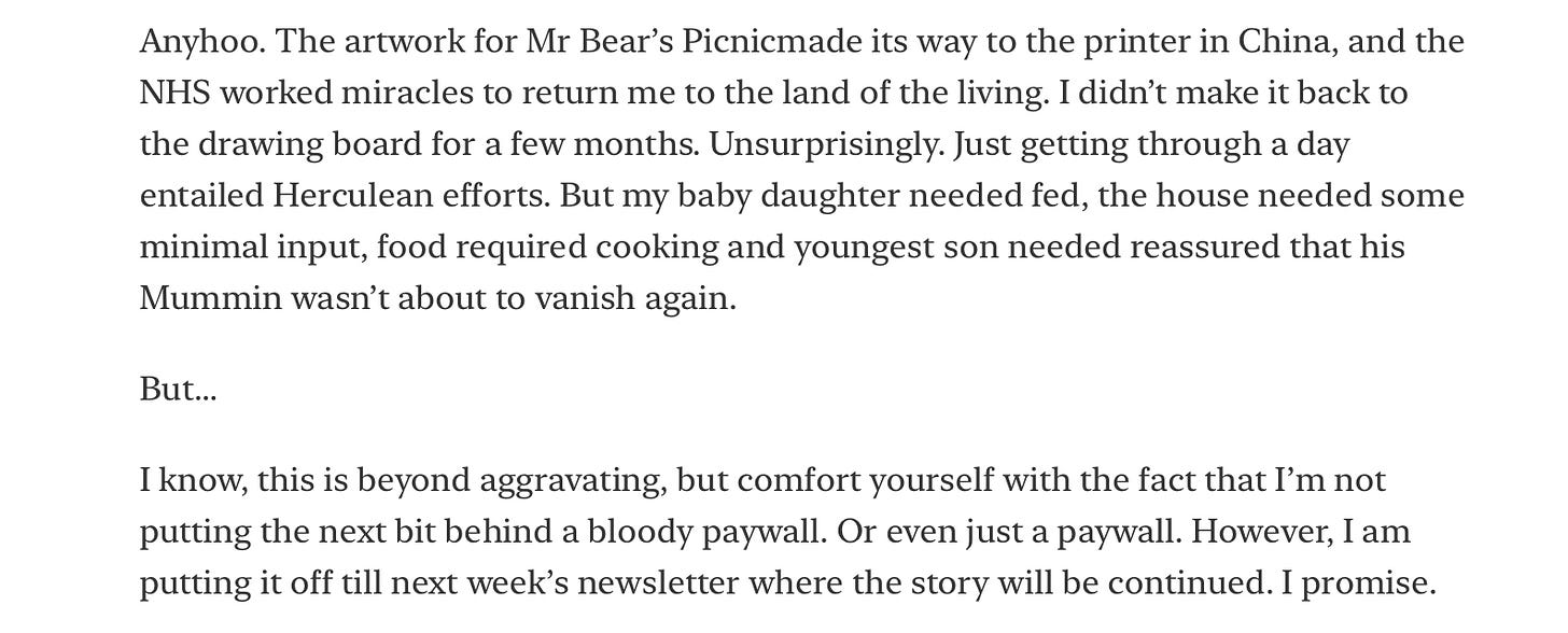 As promised, having left last week’s newsletter on something of a cliffhanger - well, maybe a sand-dune hanger, or possibly even a pebble-hang- oh, do get on with it, Gliori. Anyhoo. That. I’m just going to jump straight back in to the backstory of my book Mr Bear to the Rescue. Here’s where I left it last week:
