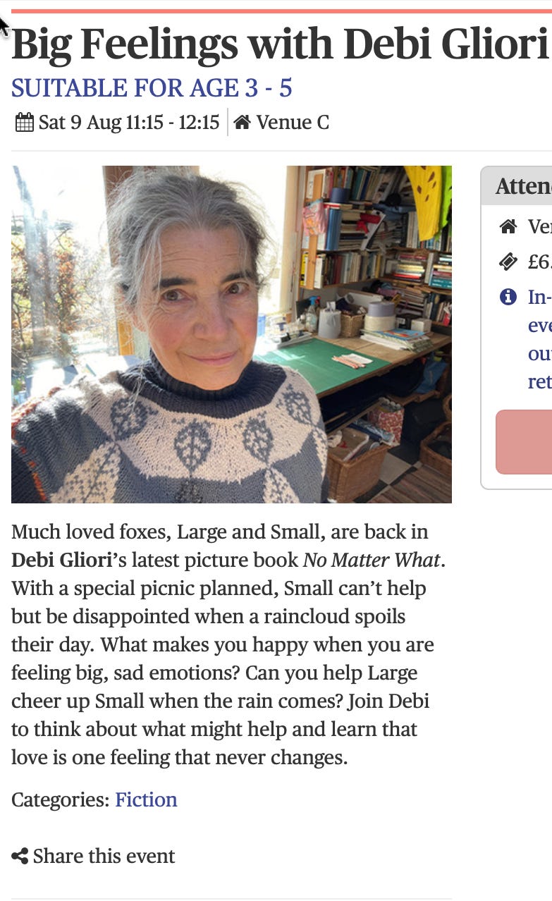 I’d be remiss if I didn’t give this upcoming event at Edinburgh International Book Festival a bit of a signal boost here. So HERE IT IS, duly shouted from the virtual rooftops of the algorithmically manufactured Subcitadel. Or is Substack more of a haystack standing proud in a vast cornfield of similar-ish stalky collections? And is my presence here, one stalk in billions, of any possible use given the ongoing horrors unfolding abroad? Big feelings with Debi Gliori. Apparently I’m going to talk to lots of very small children about “what makes us happy when we’re feeling big, sad emotions”.