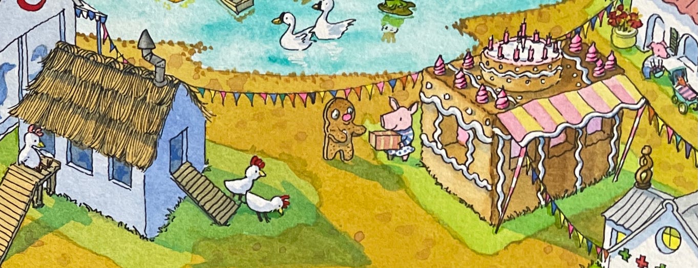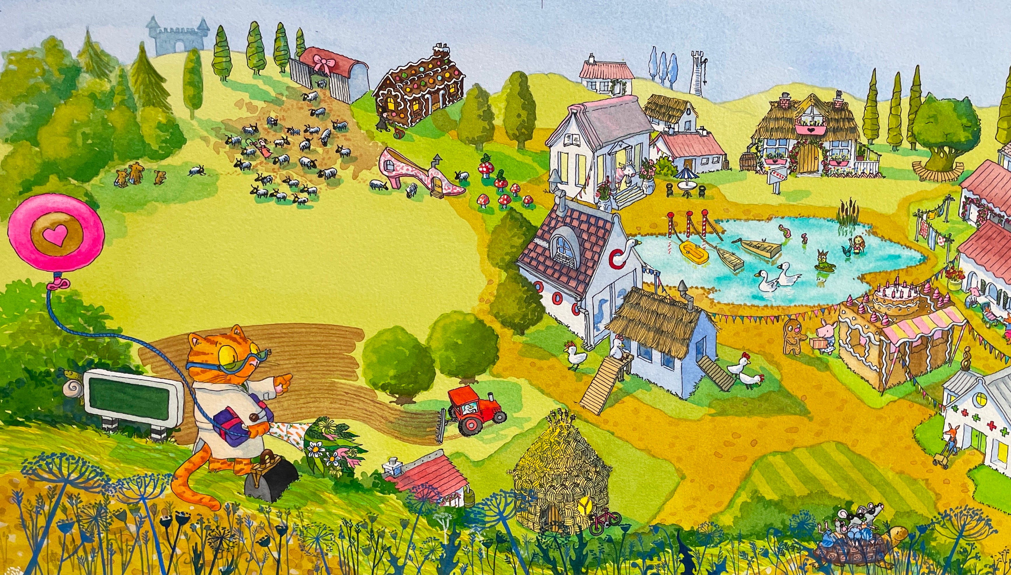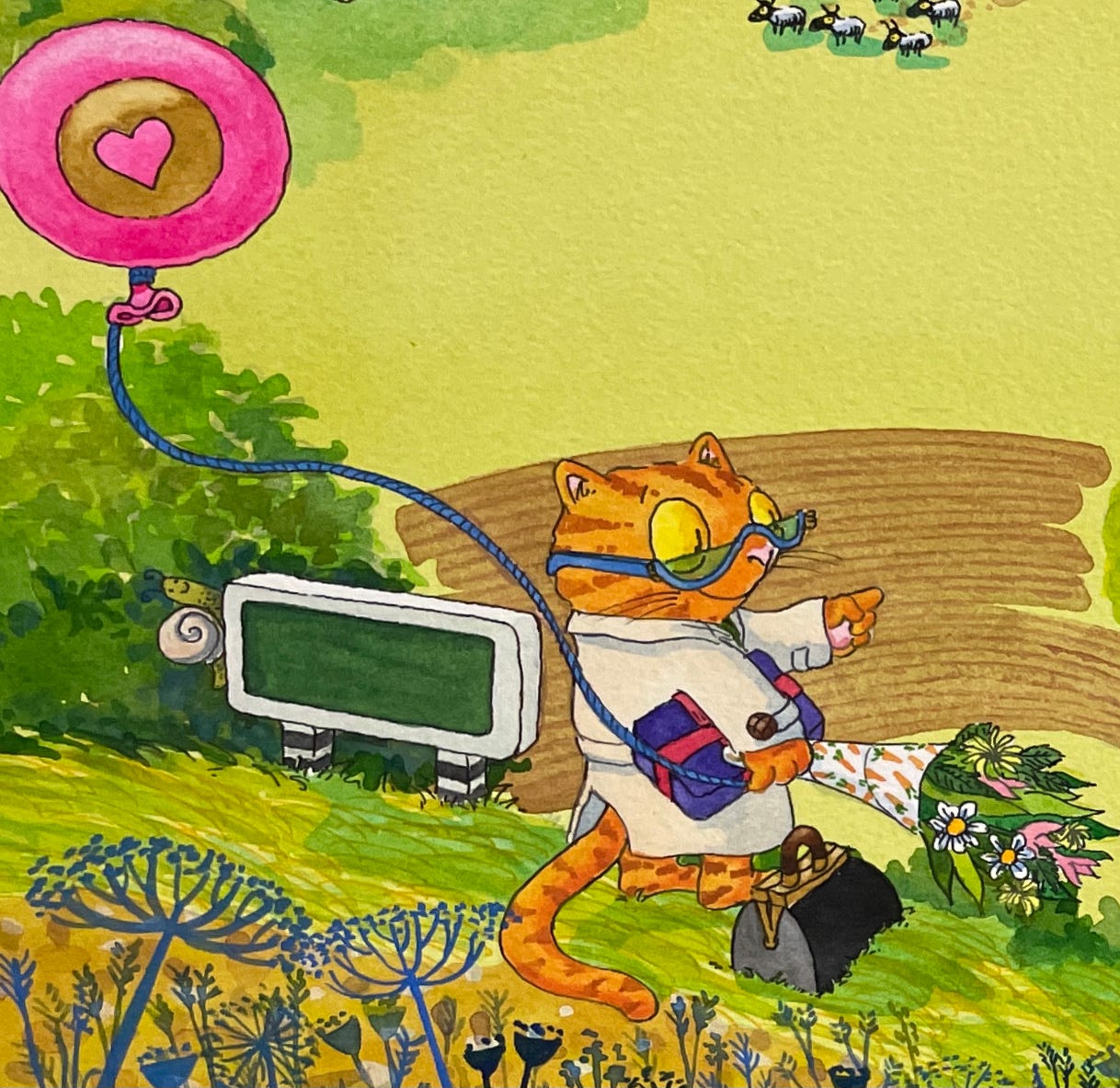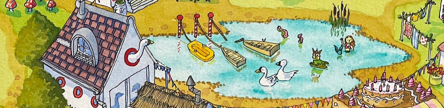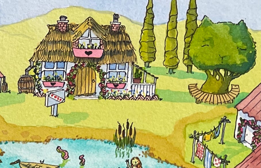 That’s the one. With the SOLD sign out front. And the thatched roof. Hope she knows a good thatcher, unlike the thatcher who - STOP. It’s a children’s book, Debi. Hope she’s got a good pension, unlike many of us in the creative sector who are feeling the chill winds of how the heck are we supposed to survive/heat/eat when we’re too old to work? With that AI gale blowing, this question keeps some of us awake at night. Anyway - let’s not go there because we’re HERE. In Hushnow, marvelling at the size of Dr Purr’s cactus in her greenhouse and hoping it’s an aloe vera, because no home should be without one. Second only to lavender oil for burns, both from sun and hot pans. Are you wondering if Dr Purr bought her new house for a bargain price because she appears to be neighbours with Cthulhu-in-pond? And who’s that waving - is she waving or drow-
