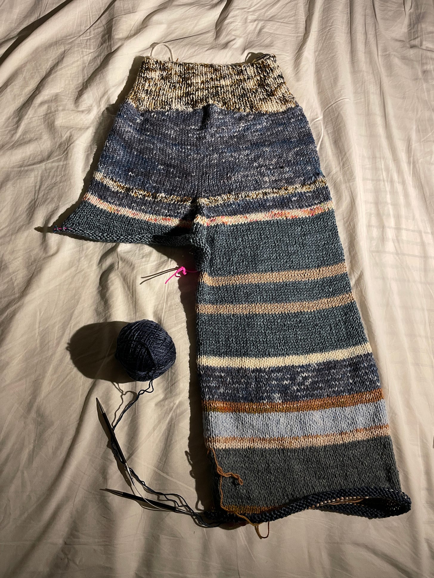 As is knitting. Currently only managing about two rows a day because of the list of tasks, exercises, more exercises, deadline and Life Inc, but still. Inching down one leg, one stitch at a time. Behold, the Pants of Equanimity.