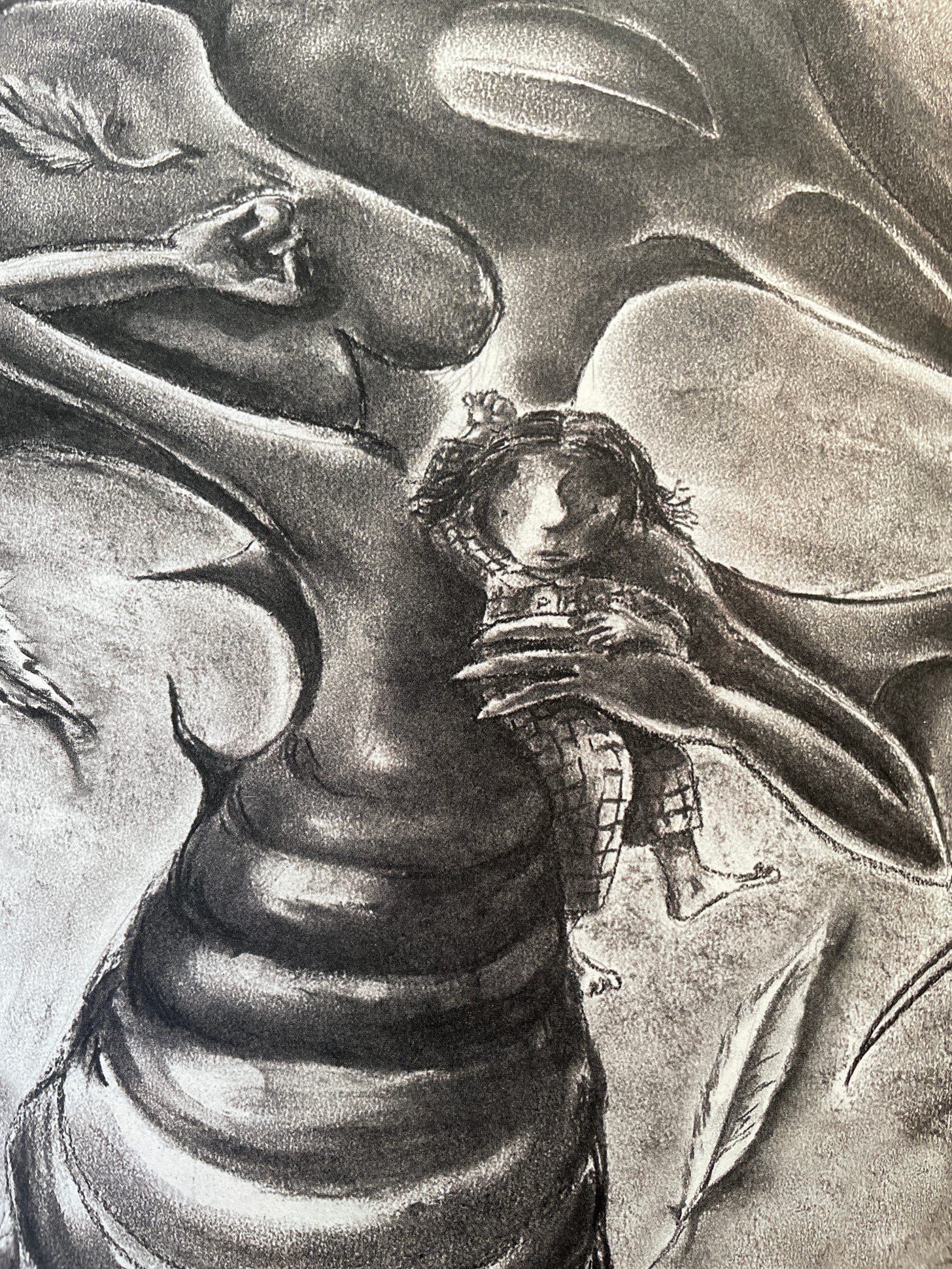 I drew this and several others, straight from my heart. With no thought as to anything other than getting a signal out. It’s so hard to quantify what’s going on inside my head when I’m in the Pit. I can’t explain in words, but I could make an attempt with images. My literary agent phoned one day to ask how I was and what I was working on, so I sent her the girl in the Pit. The rest is herstory. I’ll go into more detail when I have the psychic bandwidth, but for now, enough.