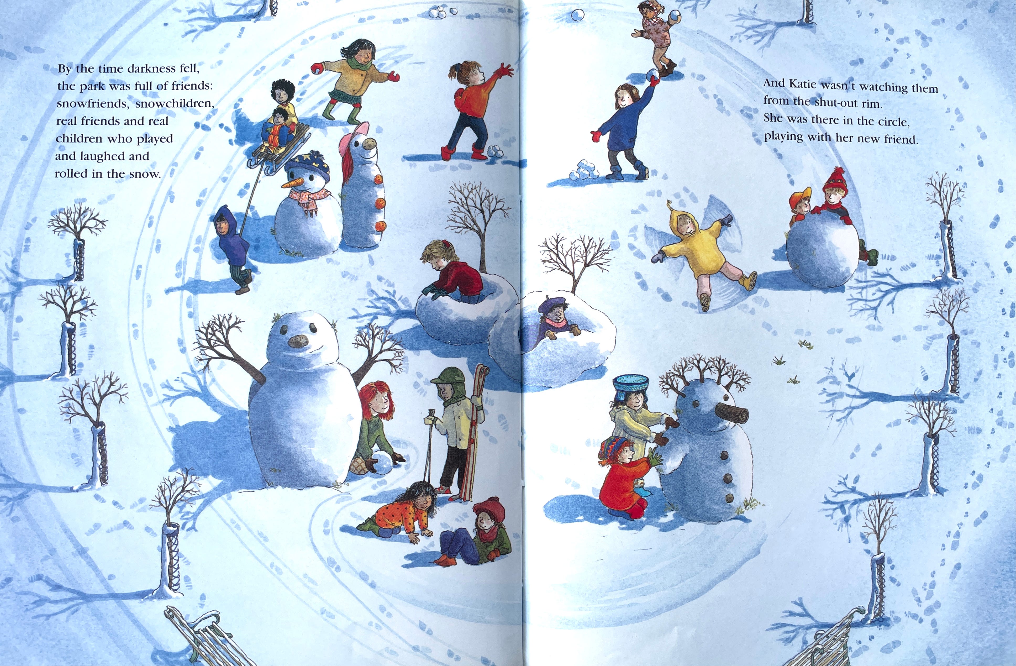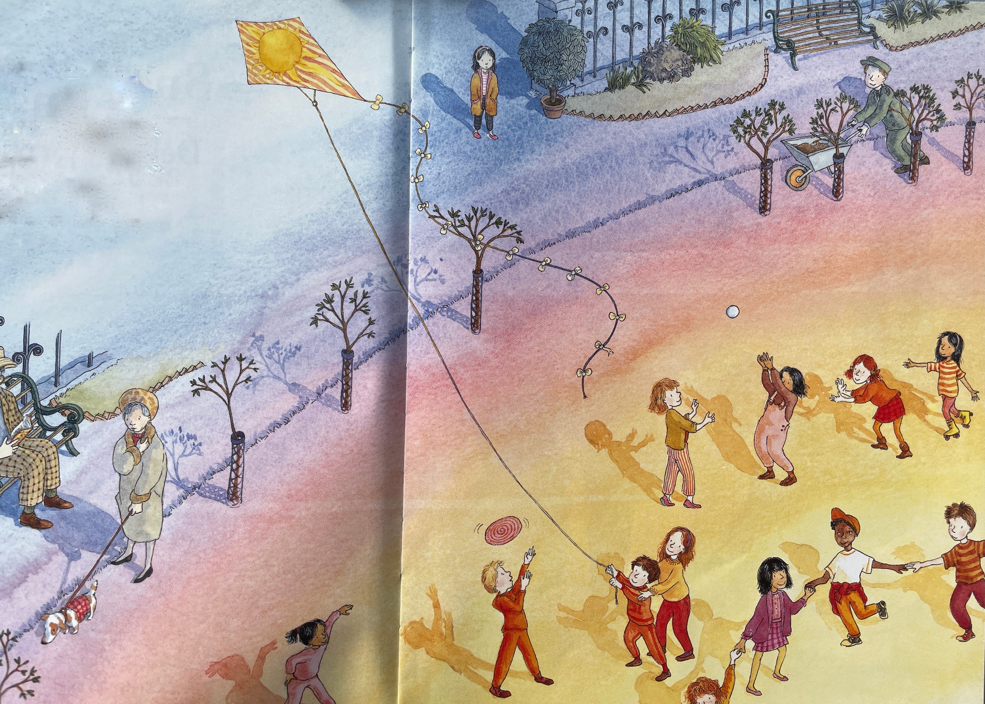 In this illustration which introduces the key themes of the story, I know I was trying to convey the feeling of not fitting in. Of being peripheral. Out of synch. I used colour deliberately to keep my little heroine in the cold, outside, looking in to the warmth.